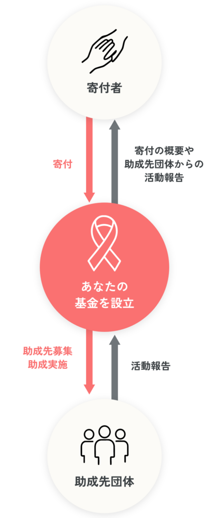 寄付者の意志を大切にしながら基金の名称や方針・助成分野などを決定した上で基金を設立し、分配や管理は当財団にお任せいただけます。
